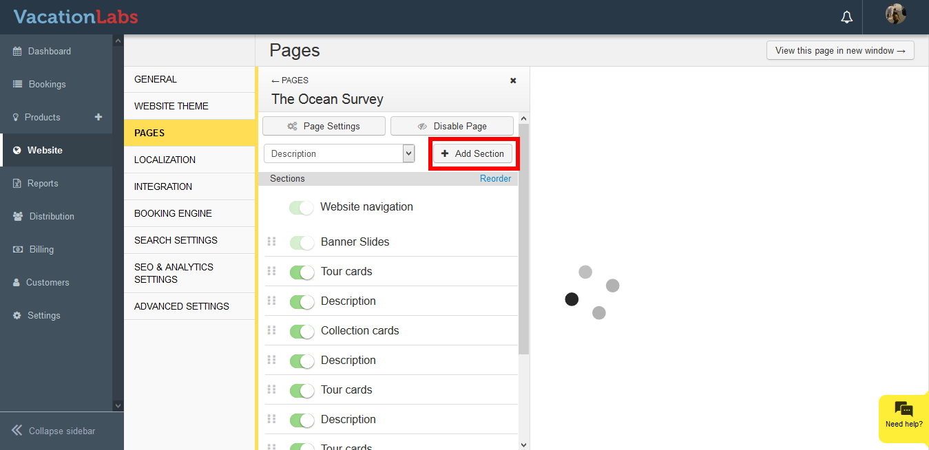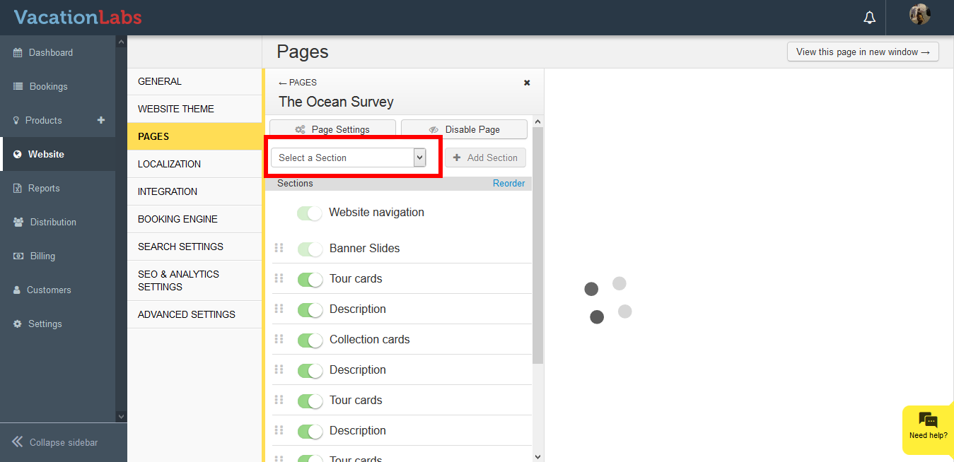 - Select the page (Homepage, static page, about us,etc) where you wish to add a section (Tour card, collection card, testimonial, etc)