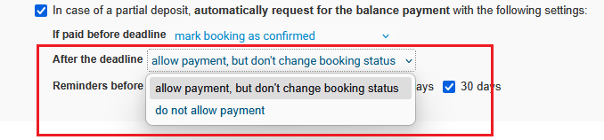 - Do not allow payment: The system will prevent any further balance payments after the deadline has passed. Customers will no longer be able to use the balance payment link.