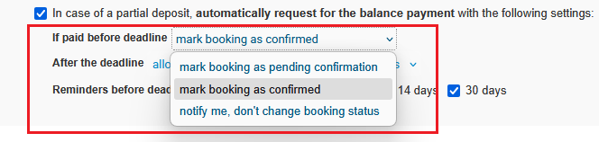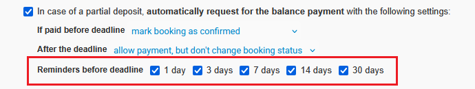 To enable this, select the option: “In case of a partial deposit, automatically request for the balance payment with the following settings:"