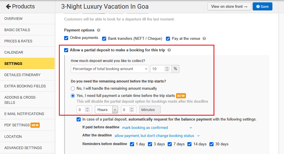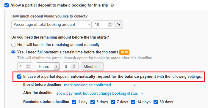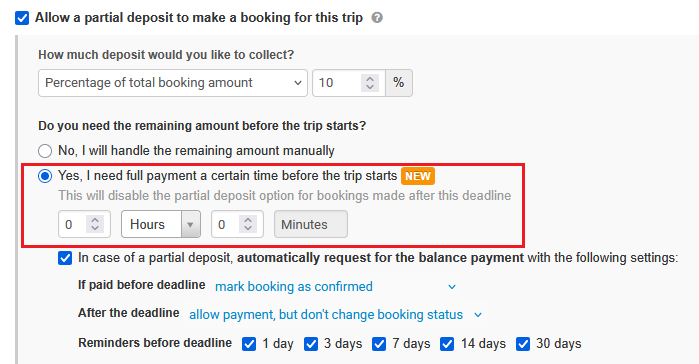 To configure a minimum deposit and set a payment deadline for your trip, go to Product > Trips > Edit the Trip > Settings. Enable the option "Allow a partial deposit to make a booking for this tour."